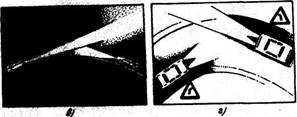 Ослепление может возникнуть также через зеркало заднего вида (рис. 2б). Очень опасно неожиданное ослепление водителей встречных автомобилей, движущихся за переломом продольного профиля дороги и за поворотом дороги (рис. 2в, 2г). В этих случаях нужно также переключить дальний свет на ближний.