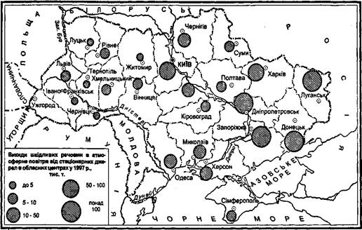 У багатьох регіонах України склалася несприятлива, а в деяких місцях - критична еколого-економічна ситуація, яку проілюстровано мовою цифр (за даними статистичних збірників «Охорона навколишнього середовища та використання природних ресурсів України» та «Еколого-географічні дослідження території України станом на 1998 р.». В Україні налічувалося 351,7 тис. організованих джерел викидів шкідливих речовин в атмосферу; 31% промислових та інших об'єктів не мали санітарно-захисних зон, розміри яких відповідали б нормативам. Кількість шкідливих речовин, що викидаються стаціонарними джерелами забруднення у 1998р. становила 18723,9 тис. т, а пересувними засобами - 1884,5тис.т». Найбільше атмосферних забруднень припадає на індустріальне розвинуті області: Донецьку, Дніпропетровську (відповідно 10,9% і 8,1%), Луганську (5,4%), Харківську (7,8%), Одеську (5,5%), Полтавську (5,6%), Запорізьку (2,8%), які в сукупності здійснюють 48,3% атмосферних викидів: