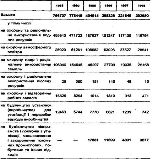 З табл. 2.1. видно, що при загальному зменшенні в 1998 р. капітальних вкладень на охорону навколишнього середовища вони дещо збільшилися порівняно з 1985 р. лише на охорону атмосферного повітря, рибних ресурсів та будівництво підприємств і полігонів з утилізації, знешкодження і захоронения токсичних промислових, побутових та інших відходів. Зменшення витрат на інші природоохоронні потреби порівняно з 1985 роком можна пояснити кризовою ситуацією економіки народного господарства. Проте, незважаючи на загальний спад у виробництві, забруднення наростає, дедалі ускладнюючи і без того несприятливу екологічну ситуацію в Україні.