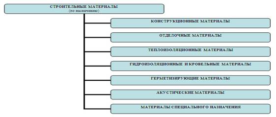 По назначению материалы подразделяются на: конструкционные, акустические, герметизирующие, отделочные, гидроизоляционные, теплоизоляционные, антикоррозионные;
