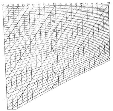 Определить относительную влажность по психрометрическому графику в следующем порядке: по вертикальной линии отметить показания сухого термометра, а по наклонным – показания смоченного; на пересечении этих линий определить значения относительной влажности. Линии, соответствующие десяткам процентов, обозначены на графике цифрами: 20, 30, 40, 50, 60, 70, 80, и 90.