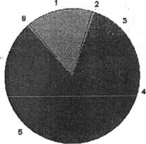 Рис.. Расчетные годовые дозы облучения человека: 1- космические лучи (0,37мЗв); 2 - радионуклиды (0,015 мЗв); 3 - калий-*0 (0,33 мЗв); 4 - другие элементы (из серии V-238, Th-232) (0,4мЗв); 5-радон (1,3 мЗв); 6 - рубидий 87 (0,006мЗв)