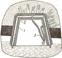 Рис. 1. Схема отвода суфлярных газов из-за обшивки: 1 – доска; 2 – воздухонепроницаемый состав; 3 – дегазационная труба