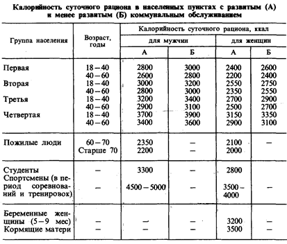 Следует подчеркнуть, что при установлении рекомендаций по калорийности и качественному составу пищевого рациона за основу была принята средняя идеальная масса тела, равная для мужчин 70 кг, для женщины 60 кг. Таким образом, эти усредненные показатели не учитывают (и не могут учитывать) детальных особенностей труда различных профессиональных групп работающих.