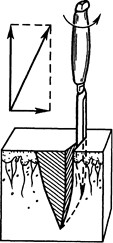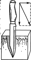 Механизм действия колюще-режущего орудия такой же, как и колющего, - погружение острого конца отвесно (или почти отвесно) по отношению к поверхности тела. Однако при этом кожа и мягкие ткани не раздвигаются, разрываясь, а разрезаются острым режущим краем. У предметов с заточкой одного края лезвия особую роль в формировании раны приобретают свойства тупого края – обушка (рис. 1).