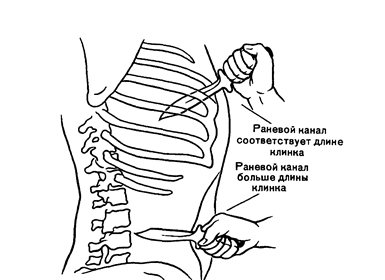 Глубина колото-резаной раны может зависеть не только от глубины погружения лезвия, но и от области ранения. Нередко дном раны служит подлежащая костная ткань. Погружение колюще-режущего предмета может быть ограничено и его рукояткой. Колюще-режущий предмет, проникая в брюшную полость, может смещать переднюю брюшную стенку и проникать значительно глубже, чем, казалось бы, позволяет его длина (рис. 2). Колото-резаные повреждения грудной клетки приводят к смещению органов и «удлинению» раневого канала. Кроме того, раневой канал может заканчиваться в полости органа (крупный сосуд, сердце, трахея).