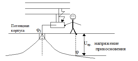 1). Напряжение прикосновения - напряжение между 2-мя точками цепи тока, которых одновременно касается человек.