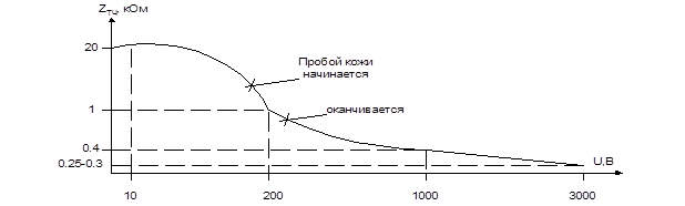 Сопротивление тела человека зависит от состояния кожи ( сухая - влажная; целая - поврежденная; чистая - грязная ), от площади и плотности контакта, от приложенного напряжения то есть Zт.ч. - нелинейная величина.