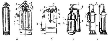 Рис. 1. Вогнегасники: а) хімічний пінний ВХП-10: 1 - корпус, 2 - поліетиленовий стакан з кислим розчином, 3 - ручка, 4 - горловина, 5 - рукоятка, 6 - шток, 7 - кришка, 8 - сприск, 9 - гумовий клапан; б) повітряно-пінний ВПП: 1 - корпус, 2 - дифузор, 3 - гумова трубка, 4 - кришка, 5 - ручка, 6 - важіль, 7 - шток, 8 - балон з повітрям, 9 - трубка сифону; в) вуглекислотний ВВ-2: 1 - суцільнотягнутий сталевий корпус, 2 - хомути кріплення вогнегасника, 3 - маховичок голчастого запірного клапана, 4 - рукоятка, 5 - дифузор; г) порошковий ВП: 1 - корпус, 2 - балон зі стисненим повітрям, 3 - шланг, 4 - патрубок.