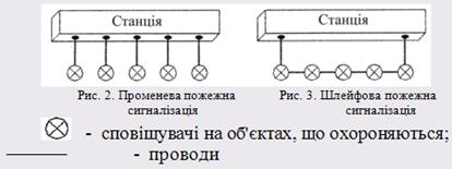 Електрична пожежна сигналізація поділяється на променеву і шлейфову (рис. 2. і рис. 3.).