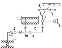 Рис. 4. Схема водяної спринклерної автоматичної системи: 1 – вододжерело; 2 – відцентровий насос; 3 – водонапірний бак; 4 – контрольно-сигнальний клапан; 5 – живильний трубопровід; 6 – розподільний трубопровід; 7 – спринклерна голівка; 8 – сигнальний пристрій; 9 – зворотний клапан; 10 – магістральний трубопровід