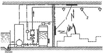 Рис. 5. Схема дренчерної установки водяного пожежогасіння: 1 - сповіщувач, 2 - дренчерні головки