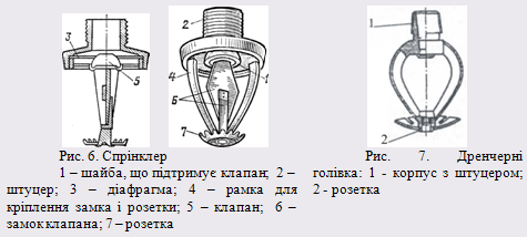 Спрінклерна голівка (рис. 6) служить датчиком для приведення в дію установки. Температура розкриття голівки 60,5°; 72°; 93°; 141°; 182°С.