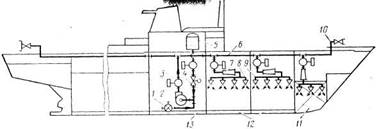 На рис. 1 показана принципиальная схема одной из простейших систем пенотушения, построенных по централизованному принципу. При такой конструкции системы пенопровод проходит по всей длине судна. Охраняемые объекты 11, 12, 13 обеспечиваются воздушно пенными стволами 7, пенорожками 10 и пеносливами 9, сообщающимися с магистральным пенопроводом 6 с помощью пенопроводов 8 с запорной аппаратурой. В систему входят также цистерна с пенообразователем 5, центробежный насос 2, дозирующий клапан 4, с помощью которого можно регулировать расход пенообразователя, поступающего к насосу.