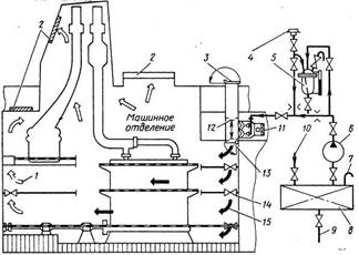 Рис. 2, Схема системы пожаротушения высокократной пеной в машинном отделении: 1-направление вытесняемых продуктов горения; 2- вентиляционное отверстие для отвода продуктов горения в атмосферу; 3- канал для выхода пены на палубу; 4-втулка наливная; 5- бак-дозатор; 6- насос для пресной воды; 7-наливная труба; 8- запас пресной воды; 9 - спускная труба; 10- трубопровод пресной воды; 11-генератор высокократной пены; 12- переключающее устройство; 13- крышка клапана; 14- отверстие в платформах; 15- направление потока высокократной пены