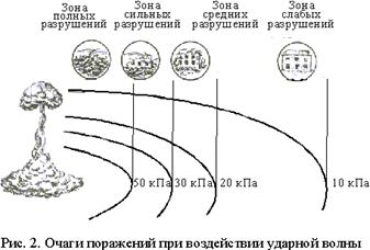 Под воздействием ударной волны создаются очаги поражения, разрушения, размеры которых зависят от мощности и вида взрыва, рельефа местности (рис. 2)