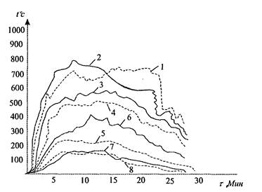 Рис. 1 Температурный режим пожара в нижней зоне здания (2 этаж)