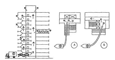 Рис. 2 Схема удаления дыма и варианты подачи воздуха в комуникационные узлы многоэтажных зданий с помощью автомобиля АДУ.