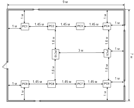 Учитывая всё выше сказанное, составим план размещения рабочих мест, который показан на рис. 1. Посмотрев на этот рисунок можно увидеть, что указанные выше расстояния не меньше указанных значений, а значит, все требования выполнены.