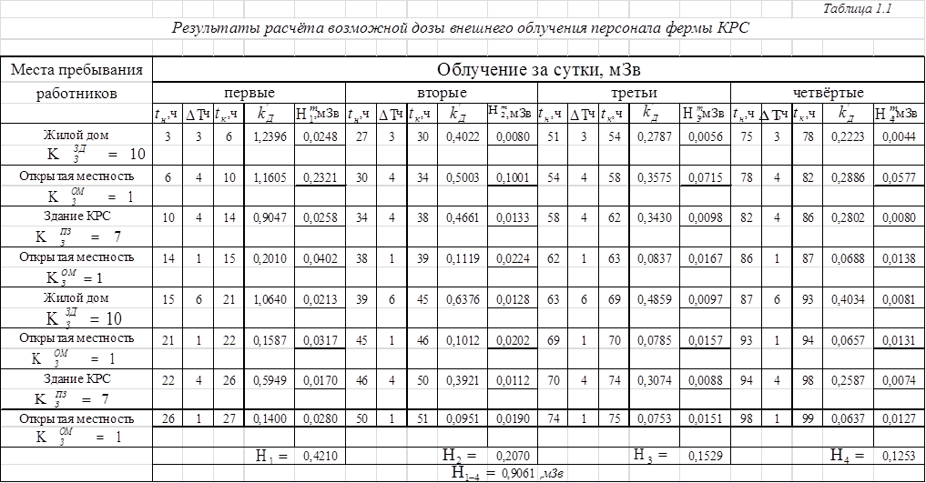 Исходя из этого режим защиты на первые сутки принимаем следующим. В течение первых 7-ми часов персонал находится в ПРУ, в течение 2-х ч работает в коровнике, на 8 часов убывает в ПРУ, в течение 2-х ч работает в коровнике, на 3 часа убывает в ПРУ. В течение вторых – четвертых суток персонал по такому же графику.