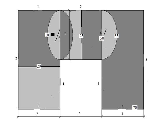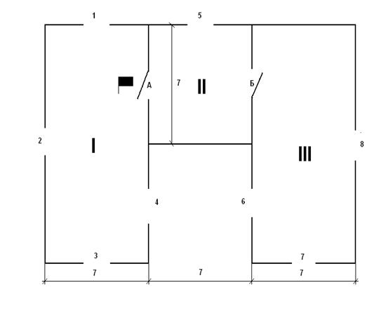 На момент времени τ = 70 минут фронт пламени заполнит полностью все помещение и в газообмене будут участвовать оконные проемы 1,2,3, 4,5,6,7, 8 и дверные проемы А и Б: