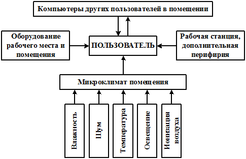 Исходя из этой системы взаимодействия, сформулируем основные требования к организации рабочих мест и рабочего процесса, которые помогут уменьшить воздействие вредных факторов от ПК. /2, С.150/