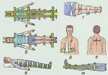 Иммобилизация при помощи подручных средств рис.1: а, б - при переломе позвоночника; в, г - иммобилизация бедра; д - предплечья; е - ключицы; ж - голени.