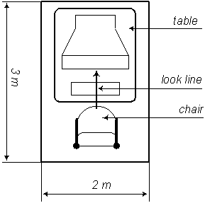 Будем считать, что на одно рабочее место отводится участок помещения длиной 3м и шириной 2м. (рис.1). Площадь будет составлять 3м × 2м = 6м2 . Это не нарушает требований СанПиН 2.2.2.542-96.