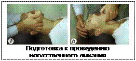 При тяжелых общих явлениях, сопровождающихся расстройством или остановкой дыхания, развитием состояния «мнимой смерти», единственно действенной мерой первой помощи является немедленное проведение искусственного дыхания, иногда в течение нескольких часов подряд. При работающем сердце искусственное дыхание быстро улучшает состояние больного, кожный покров приобретает естественную окраску, появляется пульс, начинает определяться артериальное давление. Наиболее эффективно искусственное дыхание рот в рот (16-20 вдохов в минуту).