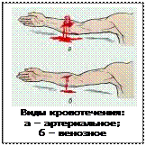 В зависимости от того, какой сосуд кровоточит, кровотечение может быть капиллярным, венозным, смешанным и артериальным. При наружном капиллярном кровотечении кровь выделяется равномерно из всей раны (как из губки); при венозном она вытекает равномерной струей, имеет темно-вишневую окраску (в случае повреждения крупной вены может отмечаться пульсирование струи крови в ритме дыхания). При артериальном кровотечении изливающаяся кровь имеет ярко-красный цвет, она бьет сильной прерывистой струей (фонтаном), выбросы крови соответствуют ритму сердечных сокращений. Смешанное кровотечение имеет признаки как