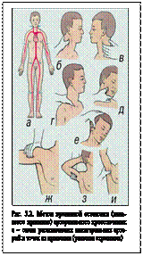При сильном артериальном или смешанном кровотечении данных мер первой помощи недостаточно. Самым доступным из них является прижатие артерии выше раны, из которой истекает кровь. Для этого необходимо знать точки, в которых артерии могут быть прижаты к кости. Как правило, в них удается прощупать пульсацию артерий. Прижатие артерии пальцем или кулаком обеспечивает почти мгновенную остановку кровотечения. Однако даже очень хорошо физически развитый человек не может достаточно долго продолжать прижатие, т.к. уже через 10—15 мин руки начинают уставать, и давление ослабевает. В связи с этим сразу же после прижатия артерии нужно предпринять попытку остановки кровотечения другим способом. Чаще для этой цели используется жгут. После наложения жгута кровотечение должно остановиться, но если оно продолжается, то жгут нужно снять и наложить вновь, отступив выше места его первоначального наложения. После наложения жгута надежно прикрепить к нему записку с указанием времени, даты наложения, фамилии и должности спасателя.