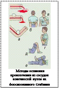 Остановка кровотечений из сосудов конечностей возможна при форсированном их сгибании. Чаще этот способ применяется для остановки кровотечений из сосудов руки. Его рационально применять при интенсивном кровотечении из ран, расположенных у основания конечностей. Максимальное сгибание конечности производят в суставе выше раны и фиксируют конечность бинтами в таком положении. Так, при остановке кровотечений из ран предплечья и кисти на сгибательную поверхность локтевого сустава укладывают ватно-марлевый пелот (его можно заменить небольшим валиком из материи), затем руку максимально сгибают в локте, притягивая с помощью бинта или ремня предплечье к плечу до исчезновения пульса на запястье, прекращения истечения крови из раны. В таком положении руку фиксируют бинтом (ремнем). При кровотечениях из верхней части плеча и подключичной области, которое может быть смертельным, заводят оба плеча за спину со сгибанием в локтевых суставах, после чего их связывают с помощью бинта (ремня и т.п.). В этом случае сдавливаются артерии с обеих сторон.