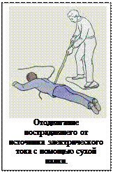 Одним из главных моментов при оказании первой помощи является немедленное прекращение действия электрического тока. Это достигается выключением тока (поворотом рубильника, выключателя, пробки, обрывом проводов), отведением электрических проводов от пострадавшего (сухой веревкой, палкой), заземлением или шунтированием проводов (соединить между собой два токоведущих провода). Прикосновение к пострадавшему незащищенными руками при не отключенном электрическом токе опасно. Отделив пострадавшего от проводов, необходимо тщательно осмотреть его. Местные повреждения следует обработать и закрыть повязкой, как при ожогах.