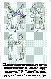 Таким образом, в самых разнообразных условиях оказывающий первую помощь может организовать тем или иным способом транспортировку пострадавшего. Ведущую роль при выборе средств транспортировки и положения, в котором больной будет перевозиться или переноситься, играют вид и локализация травмы или характер заболевания. Для предотвращения осложнений во время транспортировки пострадавшего следует перевозить в определенном положении соответственно виду травмы.