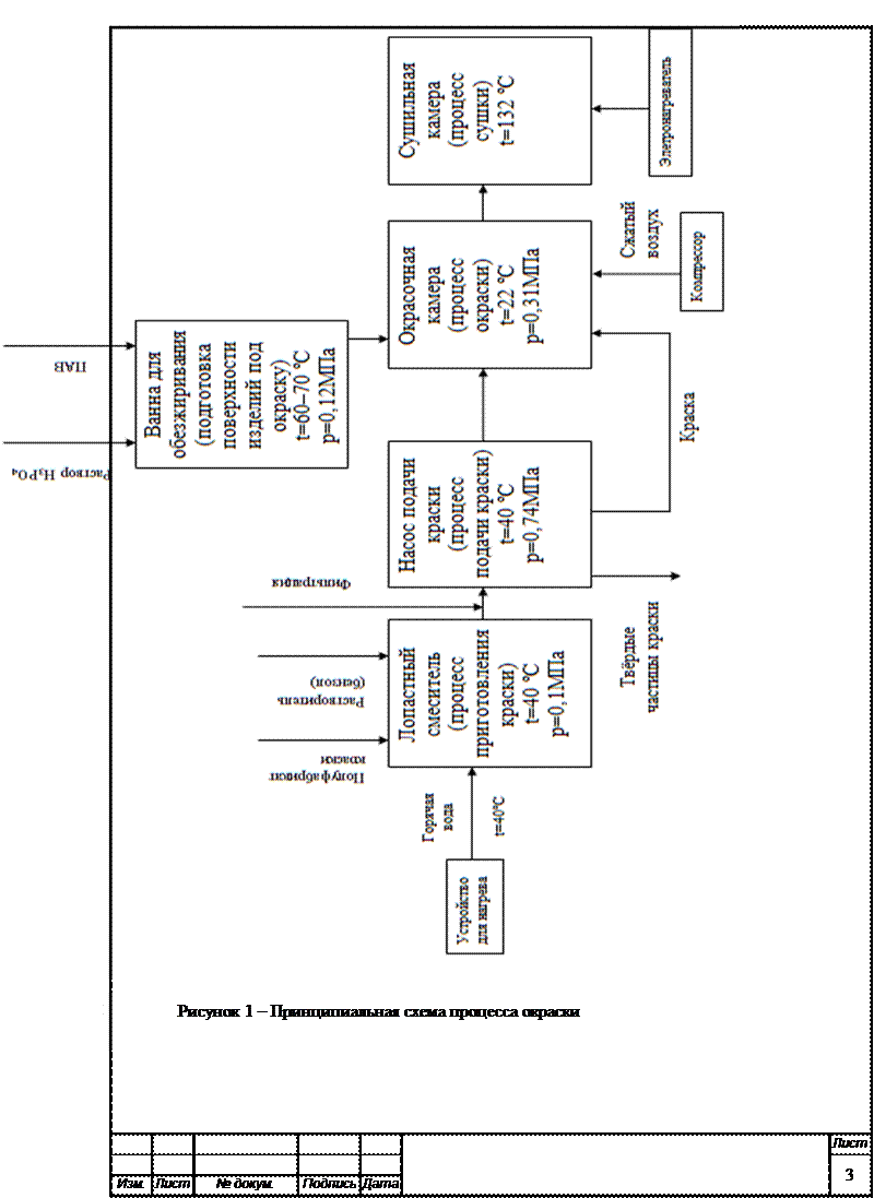 Подлежащие окраске металлические детали поступают из соседних цехов на площадку цеха окраски. Здесь детали навешивают на конвейер и он доставляет их в камеру для обезжиривания и сушки. Очищенные и высушенные детали поступают в окрасочную камеру через открытые проемы в торцовых стенах. Камера имеет два рабочих места для окраски изделий пульверизатором. К каждому пульверизатору по гибкому рукаву подводится краска от циркуляционного кольца, а по отдельному рукаву – сжатый воздух. Окрасочная камера имеет вытяжную вентиляцию. Отсасываемый воздух при выходе из камеры очищается от частичек краски, проходя через гидрофильтр. Стены окрасочной камеры после каждой рабочей смены очищаются от осевшей краски медными скребками.