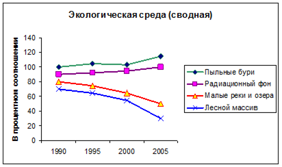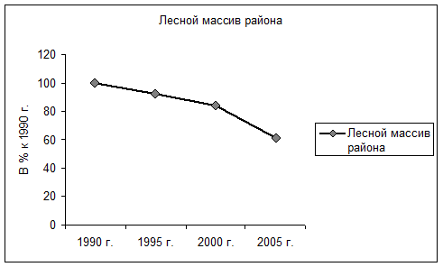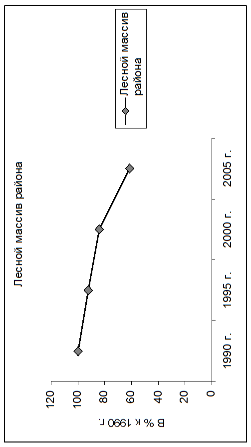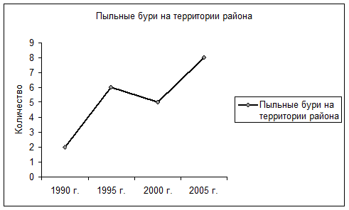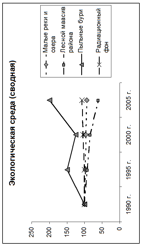 Из рисунка 11 видно, что снижение лесного массива на территории района ведет к пересыханию (истощению) малых рек и озер, с одной стороны, и росту радиационного фона и возникновению пыльно-песчаных бурь, с другой.