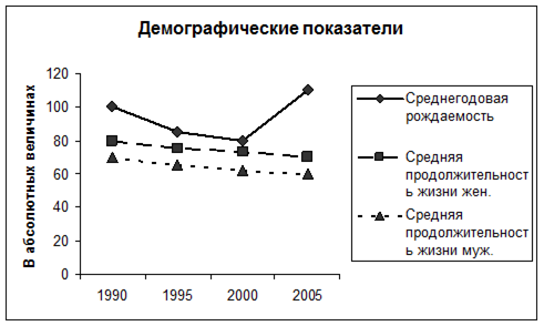 - демографические показатели снижаются. Рост рождаемости в 2005 году, спровоцированный государством за счет создания материнского капитала дал повышение численности, но не качества.