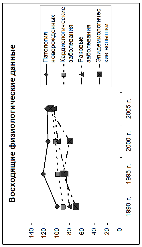 Из данной диаграммы видно, что по всем показателям негативных изменений физиологического состояния населения идет их увеличение в динамике последних 15 лет.