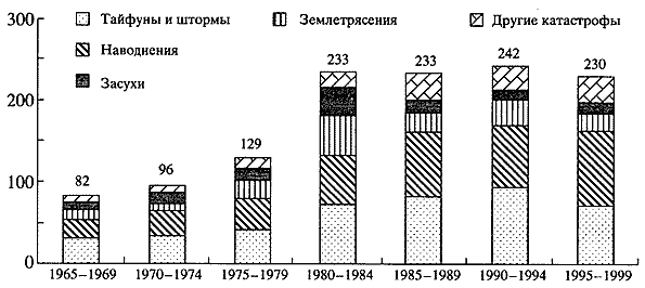 Природные катастрофы в общепринятом их понимании всегда были одним из элементов глобальной экодинамики. Стихийные бедствия и различные природные катаклизмы в прошлом происходили в соответствии с развитием естественных природных трендов, а начиная с XIX столетия на их динамику начали влиять антропогенные факторы. Развертывание в XX столетии инженерной деятельности и формирование сложной социально-экономической структуры мира резко повысили не только долю антропогенно обусловленных природных катастроф, но и изменили характеристики окружающей среды с приданием им динамики в сторону ухудшения среды обитания живых существ, в том числе и человека. По оценкам Schneider в историческом прошлом климатические сезонные вариации характеризовались высокой устойчивостью. Сезонный сдвиг за 344 года с 1651 г. не превышал одних суток за столетие. Начиная с 1940 г. в северном полушарии наметилась ярко выраженная аномалия в сезонном сдвиге. Например, в США зима 1994 г. характеризовалась рекордно низкими температурами в восточных штатах, а в июле этого года был установлен рекорд жары на юго-западе страны, когда температура достигала отметки 48.8°С. От жары летом 1994 г. в Индии погибли тысячи людей. Наоборот, вторая половина 1991 г. характеризовалась пониженными температурами, по-видимому, по причине извержения вулкана Mount Pinatubo на Филиппинах в июне 1991 г., когда в атмосферу были выброшены огромные массы пепла. В целом, наряду с процессами дестабилизации климата наблюдается рост числа катастрофических явлений. Приведенные таблицы дают некоторое представление о динамике количества природных катастроф и связанных с ними бедствиями.