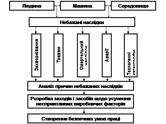 Охорона праці відноситься до достатньо складної і багатомірної галузі знань, яка нараховує більше 10 тис. документів нормативно-правового характеру. Тому при її вивченні треба використовувати системний підхід. Він передбачає взаємодію людини, машини і середовища.