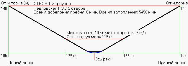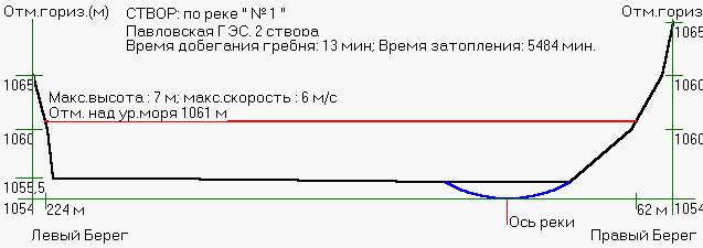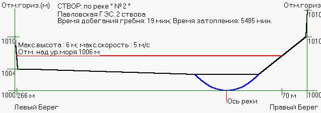 - расчетным временем прихода гребня и фронта волны прорыва в соответствующий створ;
