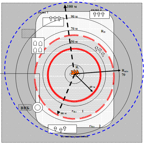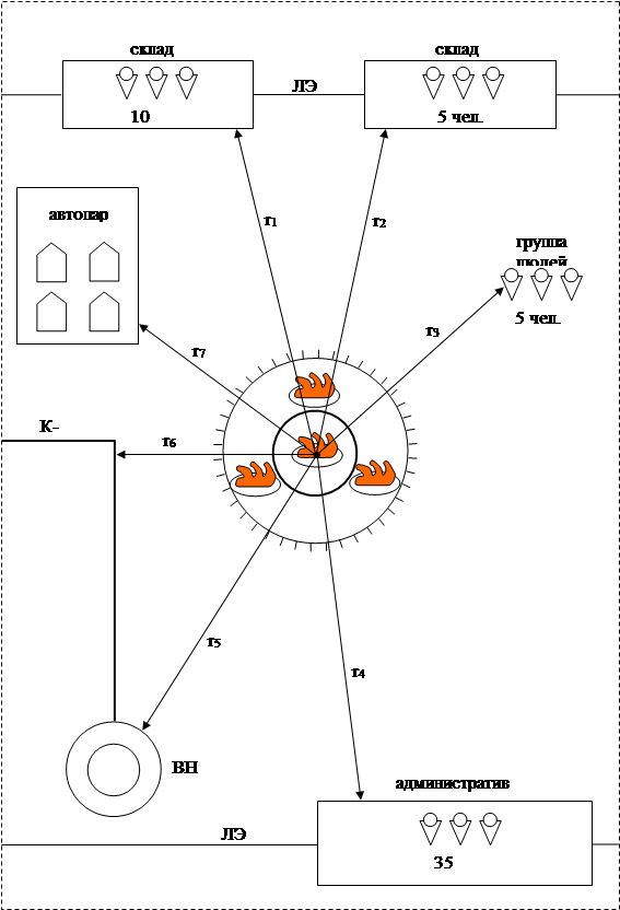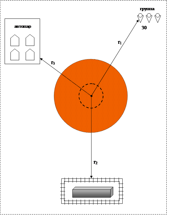 Расстояния до объектов, техники и людей в момент аварии, а также другие исходные данные приведены в табл. 1,2.