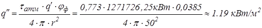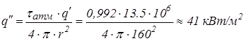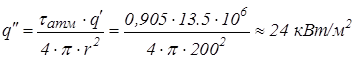 Реальная плотность теплового потока на расстоянии 200м;