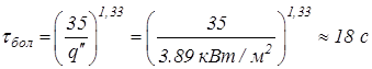 Для древесины сосновой критическая плотность теплового потока составляет 13,9 кВт/м2 ; для рулонной кровли 9–кВт/м2 (приложение 16). Согласно данным приложения 15 и 17, произойдёт воспламенение древесины и рулонной кровли при рассчитанной плотности теплового потока.