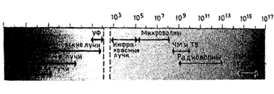 На рисунке1 представлен весь электромагнитный спектр. Как показано на этой схеме, он включает много видов излучений — от очень длинных волн, возникающих, например, при работе электрогенераторов, до очень коротких, таких, как рентгеновские и космические лучи. Световые волны, воспринимаемые глазом, тоже входят в электромагнитный спектр, но это только малая часть всего диапазона.