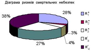 6. Оцінимо для досліджуваної людини відносні частки кожного із ризиків наразитися на смертельну небезпеку протягом року і подамо їх у вигляді діаграми: