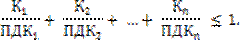 При одновременном содержании в воздухе рабочей зоны нескольких вредных веществ однонаправленного действия сумма отношений фактических концентраций каждого из них в воздухе (К1, К2, ..., Кn) к их ПДК (ПДК1, ПДК2, ..., ПДКn) не должна превышать единицы: