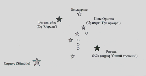 Словно окрашенная в кровь архаров красная звезда Бетельгейзе, находящаяся рядом с Поясом Ориона, называется казахами Oq, букв. ‘стрела’. Другая яркая звезда – Ригель, расположенная ниже Перевясла, именуется “Серым кремнем Когалдая” (рис. 3). Вероятно, альфа созвездия Большого Пса – Сириус представляет собой воплощение образов мифического охотника-богатыря, поразившего одной стрелой трех диких животных, и его лошади. Следует отметить, что этот замечательный персонаж встречается в фольклоре ряда этносов Северной Евразии. Поднявшись от горных вершин в звездное небо, пораженные стрелой (пулей) рогатые звери продолжают свой неутомимый бег. Их вечно преследует Небесный всадник со своими собаками, которые превратились в созвездия Большого и Малого Псов. У древних греков этот стрелок-великан получил имя по названию сочетания звезд – Орион, в армянской мифологии он известен как охотник и первопредок Хайк. Осетины почитали в сонме других божеств могучего небесного всадника Уастырджи (Уац Герги, букв. ‘Святой Георгий’).