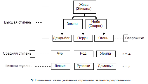 Славянская мифология имела три уровня: высший, средний и низший. На высшем уровне располагались Боги, чьи "функции" были наиболее важны для славян и которые участвовали в самых распространенных сказаниях и мифах. Это Сварог (Стрибог, Небо), Земля, Сварожичи (дети Сварога и Земли - Перун, Даждьбог и Огонь).