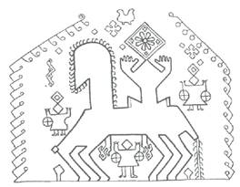 На этой уникальной вышивке нач. ХІХ ст. изображен Дажьбог в виде всадника с поднятыми к небу руками. Голова в виде криво поставленного квадрата с солярными знаками (знаками солнца) – крестами и солнцеподобной фигурой с 8 лучами.